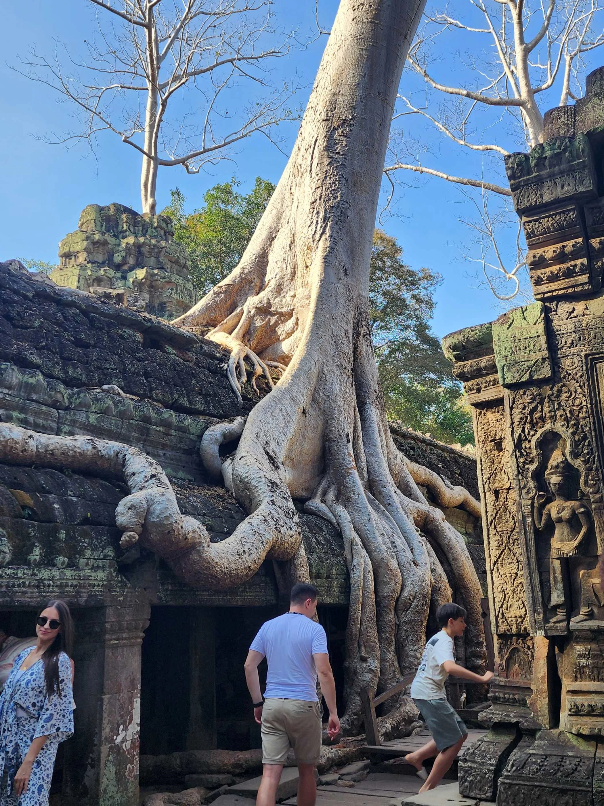 With my injury, I had to ration my energy. I was usually good for half a day, climbing up and down stone steps and covering acres of historic sites. Then I would find a bench to wait while the group went on. Of all the hours we spent visiting pagodas, perhaps the most memorable were the points where I could sit, really take in the view, listen to the birds and the wind in the trees, and watch the huge variety of people walking by. On the other hand, as pleasant as that was, it was disappointing to miss the top floor of Angkor Wat or the deeper courtyards of Ta Prohm.
