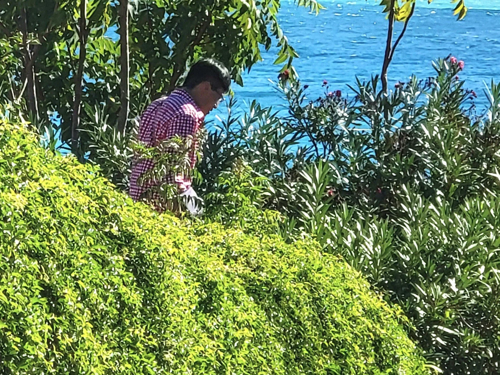 Suddenly I heard a voice yelling, “Help me! Help me!” I looked up above the bushes topping a stone wall and saw a young Asian man yelling and waving his arms. The man sounded desperate.